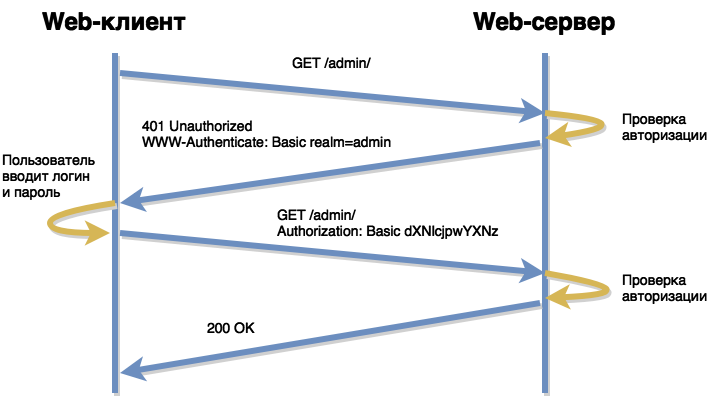 401 Unauthorized - для доступа к ресурсу нужна авторизацияWWW-Authenticate: Basic realm="admin" - запрос логина/пароля для раздела adminAuthorization: Basic Z2l2aTpkZXJwYXJvbA== - передача логина/пароля в виде