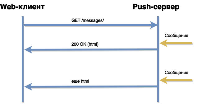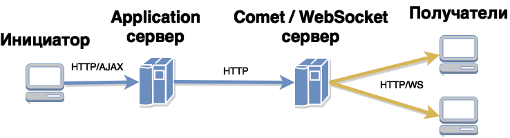 В технологии comet сервер должен поддерживать одновременно открытыми большое количество соединений, причем каждое соединение находится в ожидании сообщений для него. По этой причине мы не можем использовать классический application-сервер в роли comet-сервера. Для comet-сервера необходима отдельная технология, например nginx + mod_push.